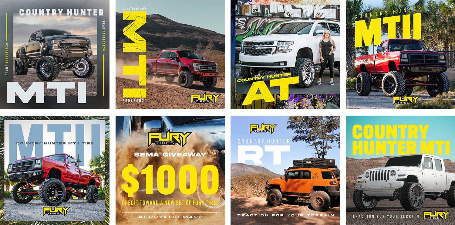 FURY Off Road Tires is deeply rooted in the aftermarket automotive industry, driven by a passion for off-road sports and exceptional driving experiences. I’ve had the opportunity to design a range of assets, including social media posts, catalogs, apparel, promotional swag, and display/event materials. Each piece reflects a commitment to quality and performance, ensuring that our products resonate with enthusiasts and enhance their adventures. Explore my work and see how design plays a vital role in bringing the FURY brand to life!